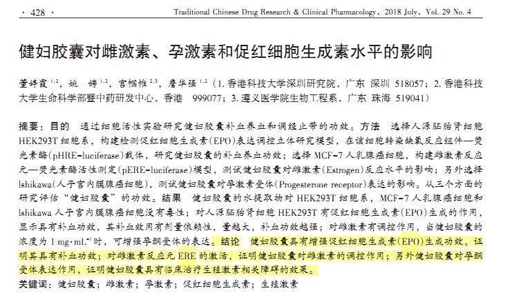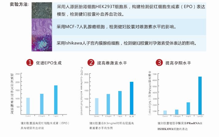 本实验证明:健妇胶囊有促血红细胞素(EPO)生成功效研究,证明其具有补血功效;对雌激素反应元的激活,证明健妇胶囊对雌激素的调控作用;另外健妇胶囊对孕酮受体表达作用,证明健妇胶囊具有临床治疗生殖激素相关障碍的效果。