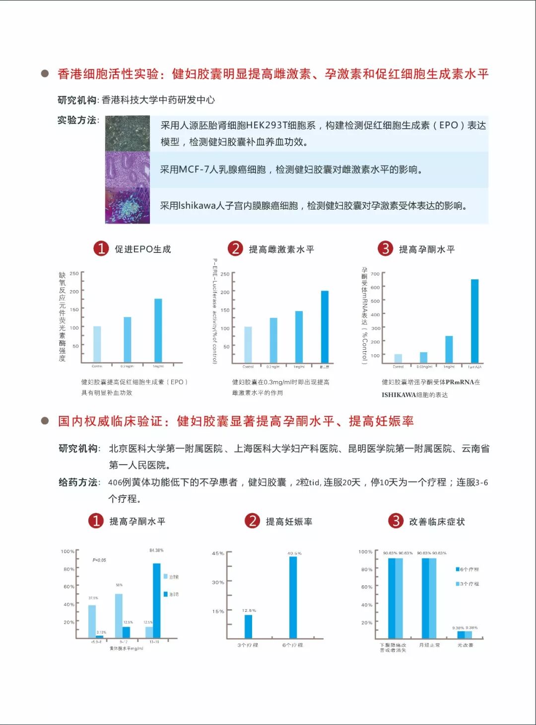 香港科技大学中药研发中心对健妇胶囊进行了细胞活性研究:它增强孕酮受体的表达、提高雌激素水平,且提高促红细胞生成素(EPO),具有明显补血功效。